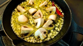 香りが立ってきたら、マッシュルームを入れ、塩コショウも振ります。