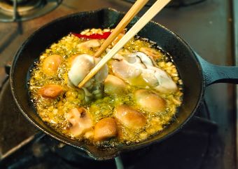 最後に牡蠣をそっと入れます。(水分をよく取っておかないと油がはねるので注意です)