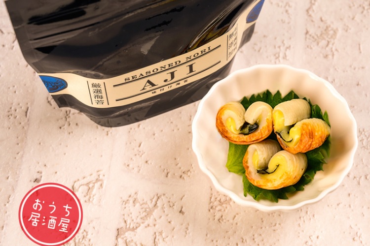 4. ちくわを広げて、スライスチーズ、味付け海苔をのせて、丸めてハート型にし、爪楊枝で固定します。