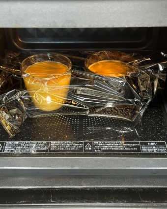 ターンテーブルのないレンジであれば左右を入れ替えてさらに200Wで2分加熱します。(2分加熱したあともまだ固まっていなければその後は様子をみて1分ずつ加熱します)