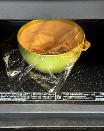 ふんわりラップをかけ200Wのレンジで8分加熱します。