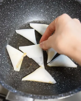 春巻きを1枚はがして、まな板に用意します。