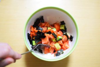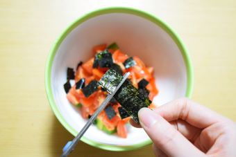 大きめのボウルに1と2を入れ、姫ひじき塩海苔も同じく1cm角になるようハサミで切ります。