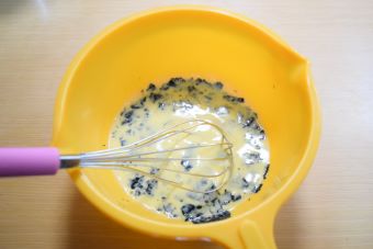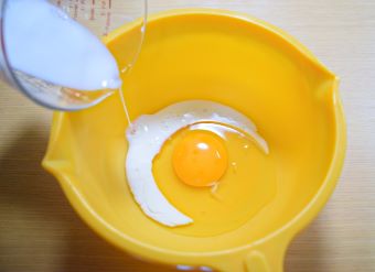 ボウルに卵と牛乳を入れます。
