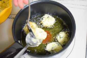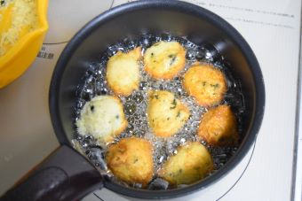 160℃に熱した油にスプーンを2つ使って丸めて落とします。