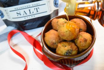 生地に海苔を混ぜ込んだ一口ドーナツです。外はサクッと中はふわっとしていて、ふんわり海苔の風味が香ります。メープルシロップがとっても合います。ピックで召し上がれ。