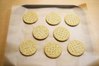トースターの天板にクッキングシートを敷き、クラッカーをのせます。
