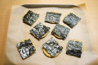 塩海苔を半分に折って切り、クラッカーの上にのせます。br>