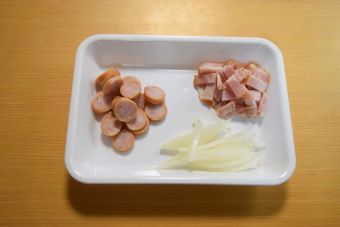 ソーセージ、ベーコン、玉ねぎは写真のように切っておきます。