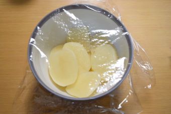 ⑤にラップをふんわりとかけ、500Wで1分ほど加熱します。