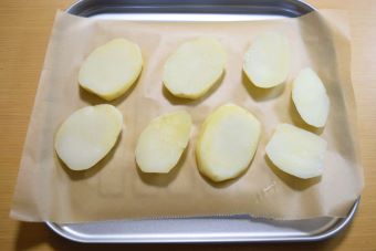 トースターのトレーに④のじゃがいもを並べます。