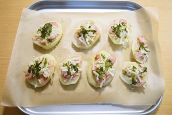 じゃがいもの上に⑥の具材をのせ、ピザ用チーズ、粉チーズ、ばら干しのりをかけます。
