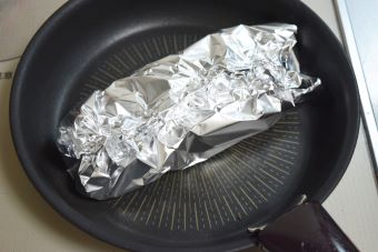 アルミホイルで2重に包んで30分放置します。(フライパンに蓋をして置いておきます。)