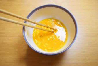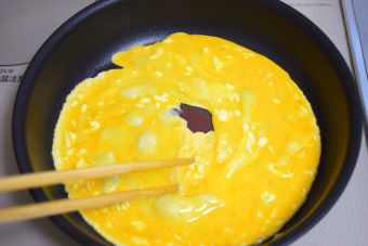 中火で熟したフライパンにごま油を引き、②を入れて菜箸でかき混ぜつつ、半熟状態になったら一度取り出しておきます。