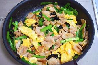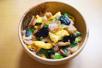姫ひじき塩海苔を使った豚バラニラ玉丼