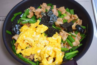 海苔は8等分くらいの大きさにちぎって加え、③の卵を入れて炒めます。