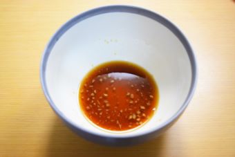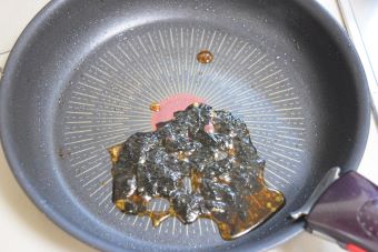 フライパンをキッチンペーパーで軽く拭き、そこに②のたれの残りとちぎった紫蘇海苔を加え、とろっとするまで火にかけます。
