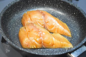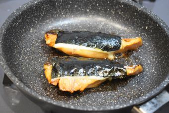 フライパンに油をしき、軽く水気を切ったさわらを皮目から弱火で4分焼きます。