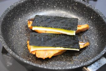 焼き目がついたら裏返して、皮目に半分に切ったチーズ、紫蘇風味味付け海苔をのせます。