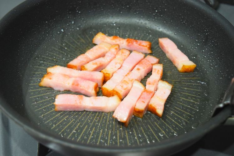 ベーコンに焼き色が付いたら白ワインを加えます。