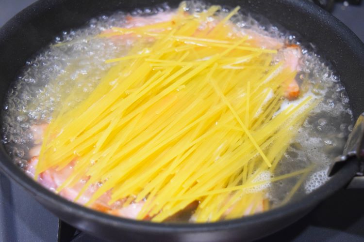 アルコールを飛ばしたら塩、水を加えます。沸騰したら半分に折ったパスタを加えて既定の時間茹でます。