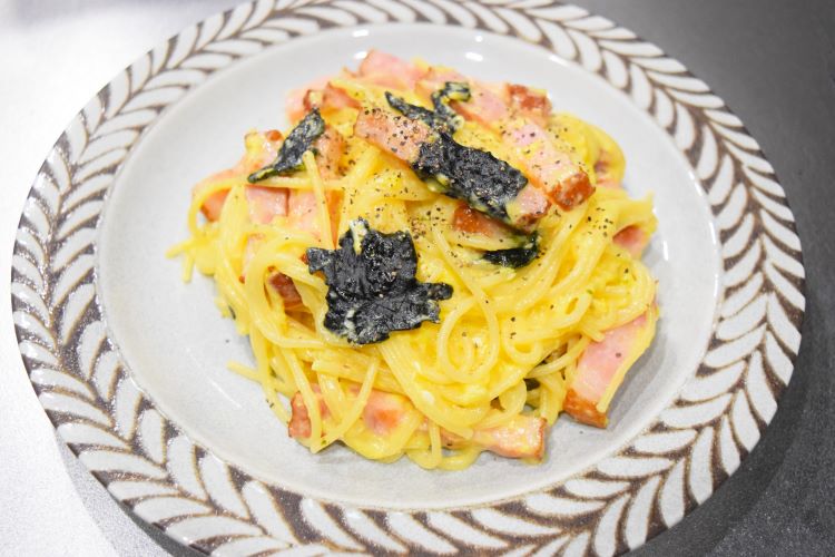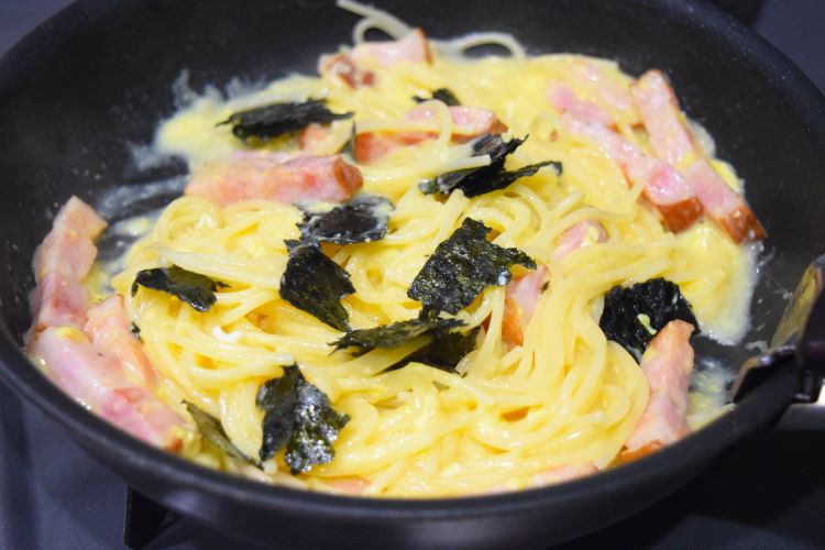 フライパン1つでできるカルボナーラです。オイスターの海苔を使うことで簡単にワンランク上のアレンジにできちゃいます。
