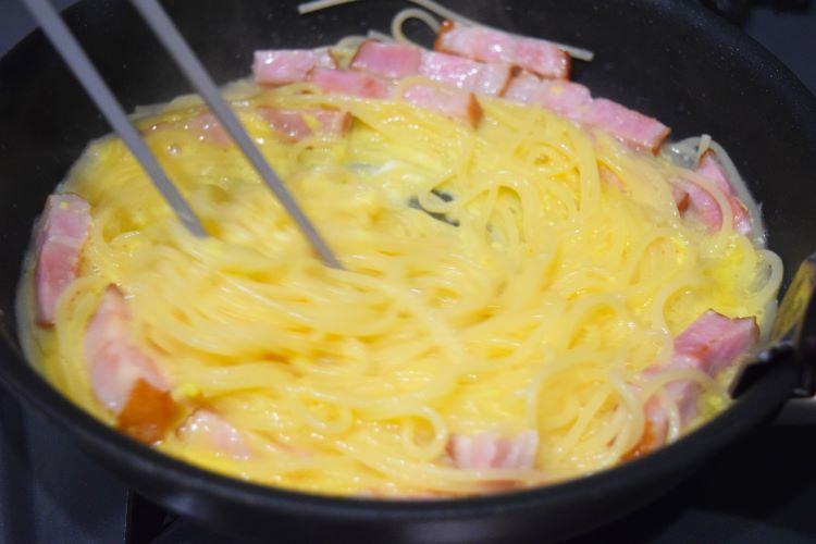 フライパン1つでできるカルボナーラです。オイスターの海苔を使うことで簡単にワンランク上のアレンジにできちゃいます。