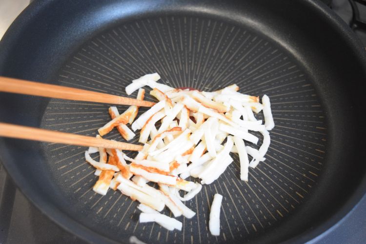 フライパンにごま油小さじ2を入れてちくわを焼き色がつくまで炒めます。