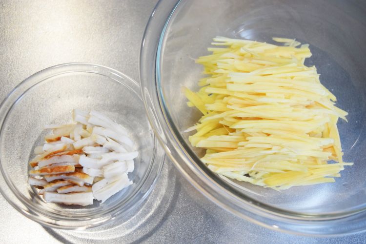 じゃがいもは皮をむき千切りに、ちくわは3cmほどの長さの細切りにします。