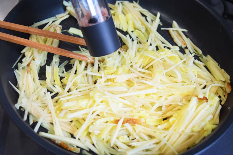 チーズを入れて塩こしょうをふり、チーズが溶けるまで炒めます。