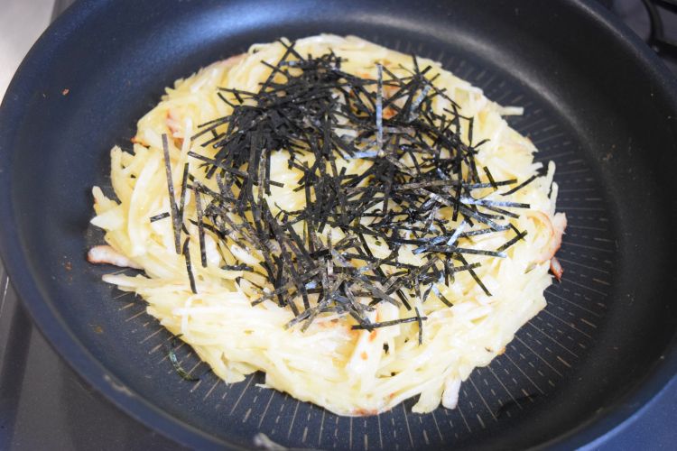 焼き色がついたらきざみ焼き海苔を散らしたあと、ひっくり返します。