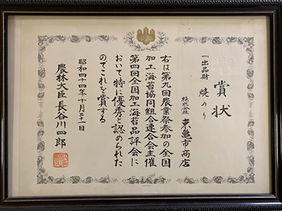 同年、全国加工海苔品評会の“焼海苔”部門で、農林大臣から優秀賞を受賞。