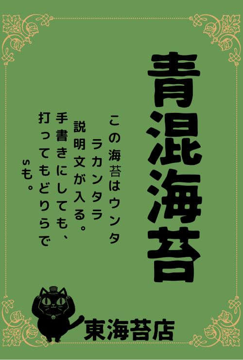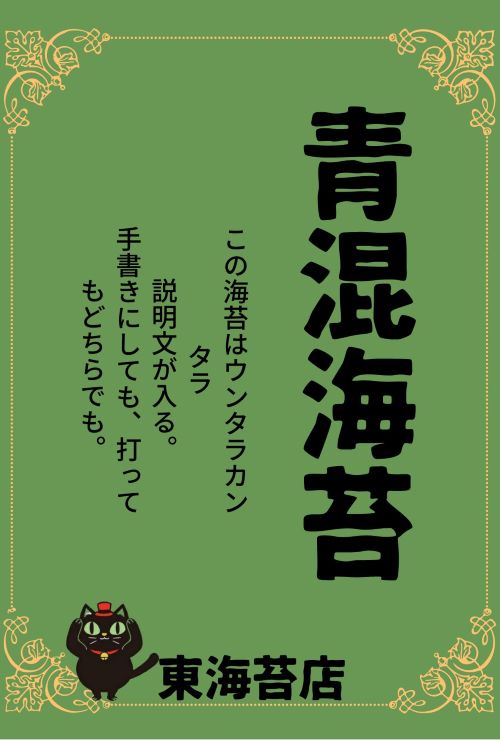 字をもう少し泳がせた方がいいかな?と、他のスタッフの提案で「青混海苔」の字を散らしてみることに。